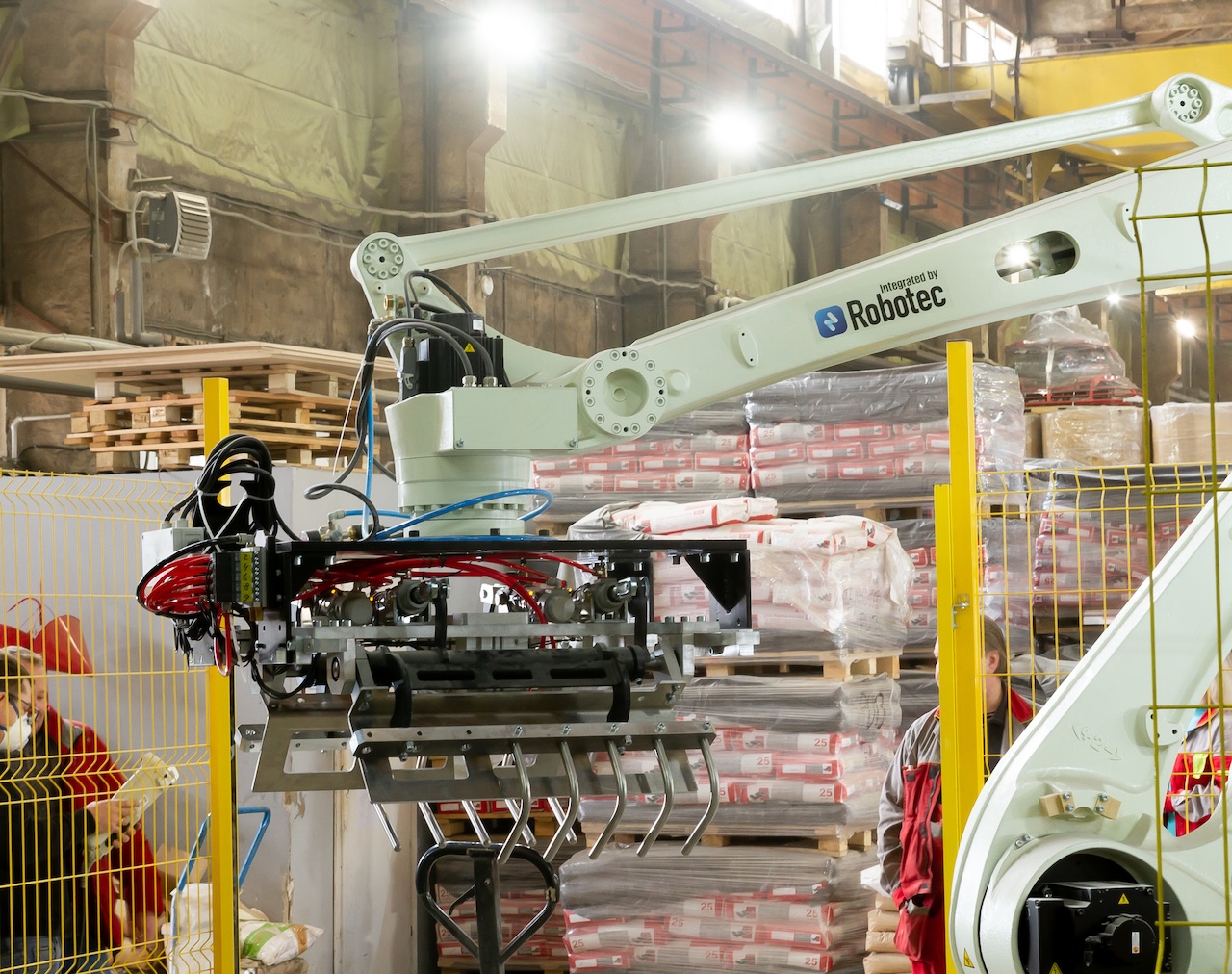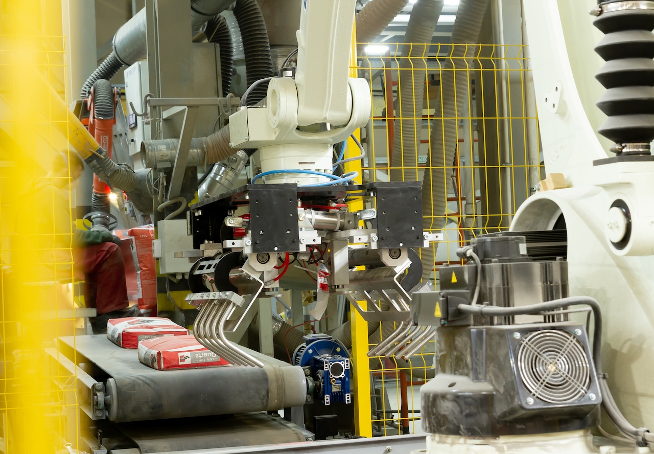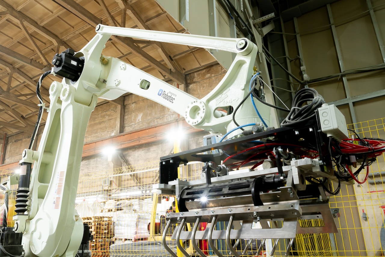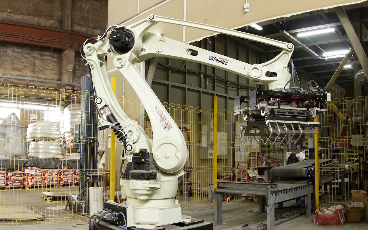 Для автоматизирует процесса паллетирования был подобран робот с грузоподъемностью 180 килограмм. РТК позволяет в автоматическом режиме производить забор мешка с конвейера и укладывает его на паллет согласно заданной схеме укладки. Решение позволяет увеличить скорость укладки мешков со строительной смесью на паллеты.