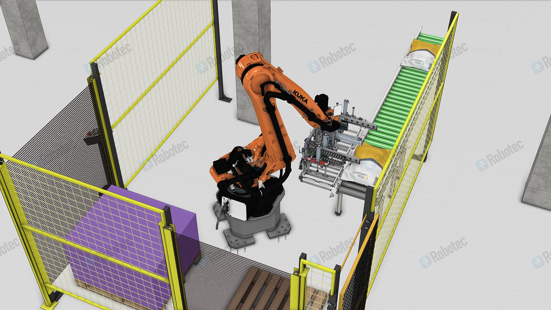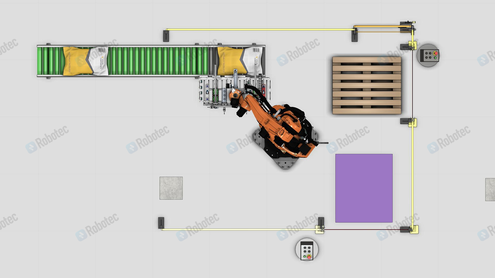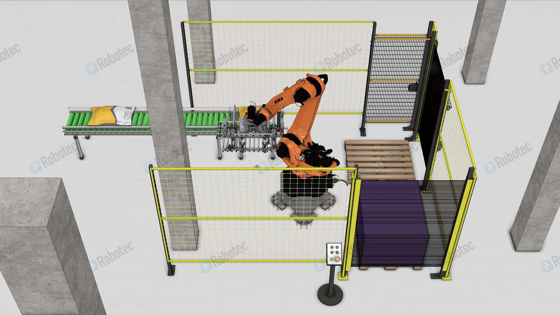 Для автоматизирует процесса паллетирования был подобран робот с грузоподъемностью 180 килограмм. РТК позволяет в автоматическом режиме производить забор мешка с конвейера и укладывает его на паллет согласно заданной схеме укладки. Решение позволяет увеличить скорость укладки мешков со строительной смесью на паллеты.